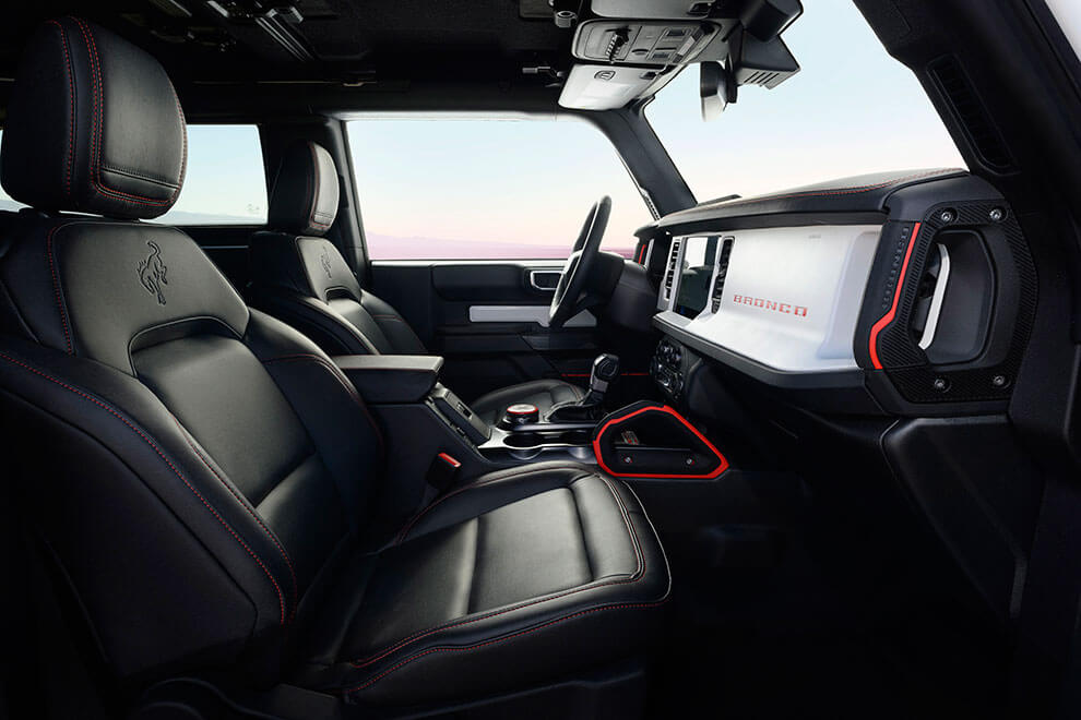 برونکو استروپ ویژه با پنل سفید داخل کابین که اولین بار در برونکو Heritage معرفی شد متمایز میشود، اما از تزیینات نارنجی کد در سراسر کابین بهره میبرد. این تزیینات شامل نشان “Bronco” روی داشبورد، قاب دکمه حالت GOAT، داخل دستگیرهها و دوختهای متضاد روی داشبورد و صندلیها میشود. همچنین، کنسول مرکزی نشان ویژه “Stroppe Special Edition” دارد.