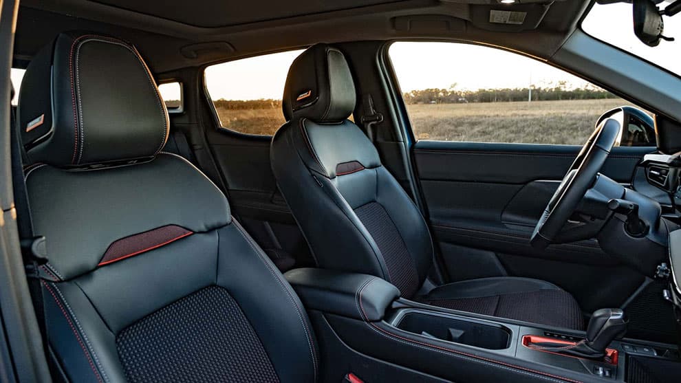 فضای داخلی این خودرو نه تنها زیباست بلکه راحت هم هست. مقدار زیادی پلاستیک مشکی در آن به کار رفته است—هم براق و هم مات—اما هیچکدام از آنها احساس ارزانی نمیدهند. مدل SR ویژگیهای اضافی مانند چرم واقعی روی فرمان و اهرم دنده، تزیینات فیبر کربن مصنوعی (چون که اسپرت است!) و دوخت نارنجی رنگ را اضافه کرده است که همه اینها حس پریمیوم بودن را به آن میدهد.