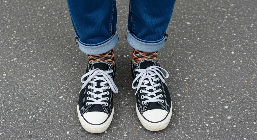 - شلوار جین: لبه شلوار جین خود را کمی تا بزنید (Cuff) تا ساق کفش دیده شود.
