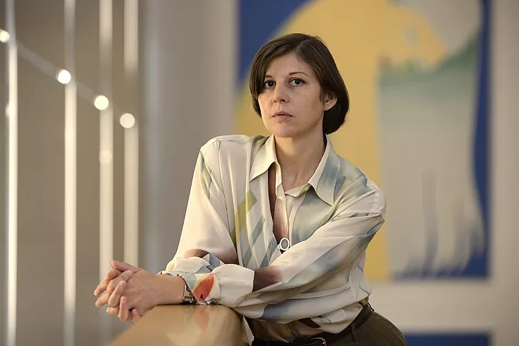 - Lucy McKenzie in front of the work “Mooncup” (2012) in the exhibition “Lucy McKenzie – Prime Suspect”Lucy McKenzie. Photo: Robert Haas