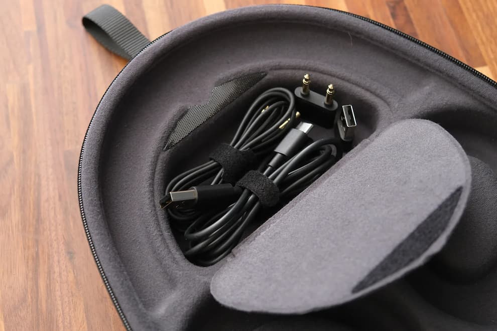 علاوه بر دانگل USB-C، یک مبدل Type-C به Type-A نیز همراه هدفون است تا با دستگاههای قدیمیتر نیز سازگار باشد. این تجهیزات در کیف مقاوم پارچهای جای میگیرند. همچنین یک کابل شارژ Type-A به Type-C و کابل ۳.۵ میلیمتری برای استفاده سیمی نیز داخل کیف قرار دارند. حتی یک مبدل دوگانه قدیمی برای سیستمهای سرگرمی هواپیما نیز وجود دارد.