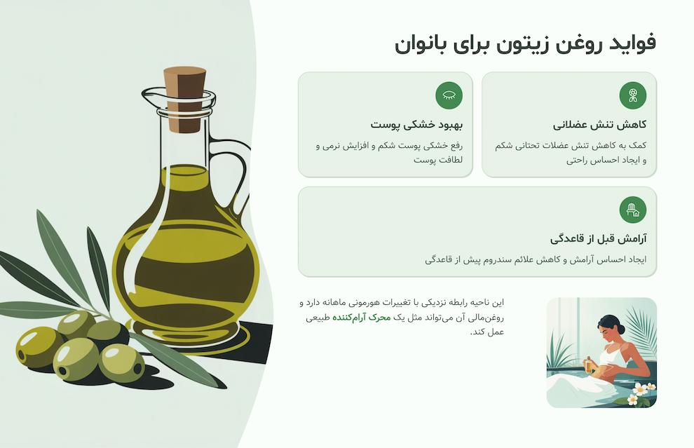 | کاربرد اصلی | نرمی پوست اطراف شکم، ایجاد حس آرامش و کمک به یبوست خفیف | ۲–۳ قطره روغن زیتون بکر، ماساژ ملایم دور ناف |