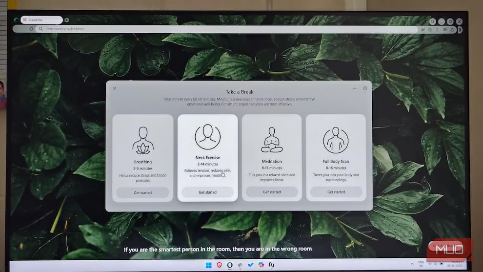 دو ویژگی کوچک اما مهم در نوار کناری مرورگر وجود دارد: Boost و Take a Break، که اساس کارکرد آرامساز Opera Air را شکل میدهند. با انتخاب گزینه Take a Break، مرورگر یک پنجره کوچک نمایش میدهد که شامل چهار قابلیت است: تنفس، تمرین گردن، مدیتیشن و اسکن بدن. شاید در ابتدا شبیه یک شوخی به نظر برسد، اما در لحظهای که کاربر زیر فشار کاری با بیش از بیست تب باز قرار داشته، همین ویژگی توانسته او را با یک تمرین تنفس چند دقیقهای آرام کند و تمرکز را به او بازگرداند.