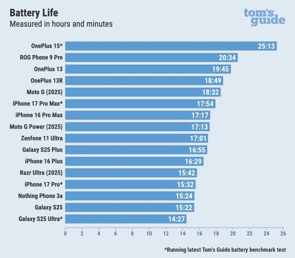 تمام گوشیهای موجود در نمودار از نسخه قبلی تست استفاده کردند، در حالی که مدلهای جدید مانند گوشی OnePlus 15، گوشی iPhone 17 Pro Max، گوشی iPhone 17 Pro و گوشی Samsung Galaxy S25 Ultra از نسخه بهروز تست بهره بردهاند.