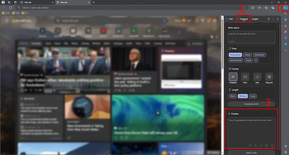 کاربران مرورگر Edge حتی سادهتر میتوانند به این قابلیت دسترسی پیدا کنند. با انتخاب آیکون Copilot در نوار کناری یا رفتن به تب Compose، مستقیم میتوانید شروع به نوشتن درخواست کنید.