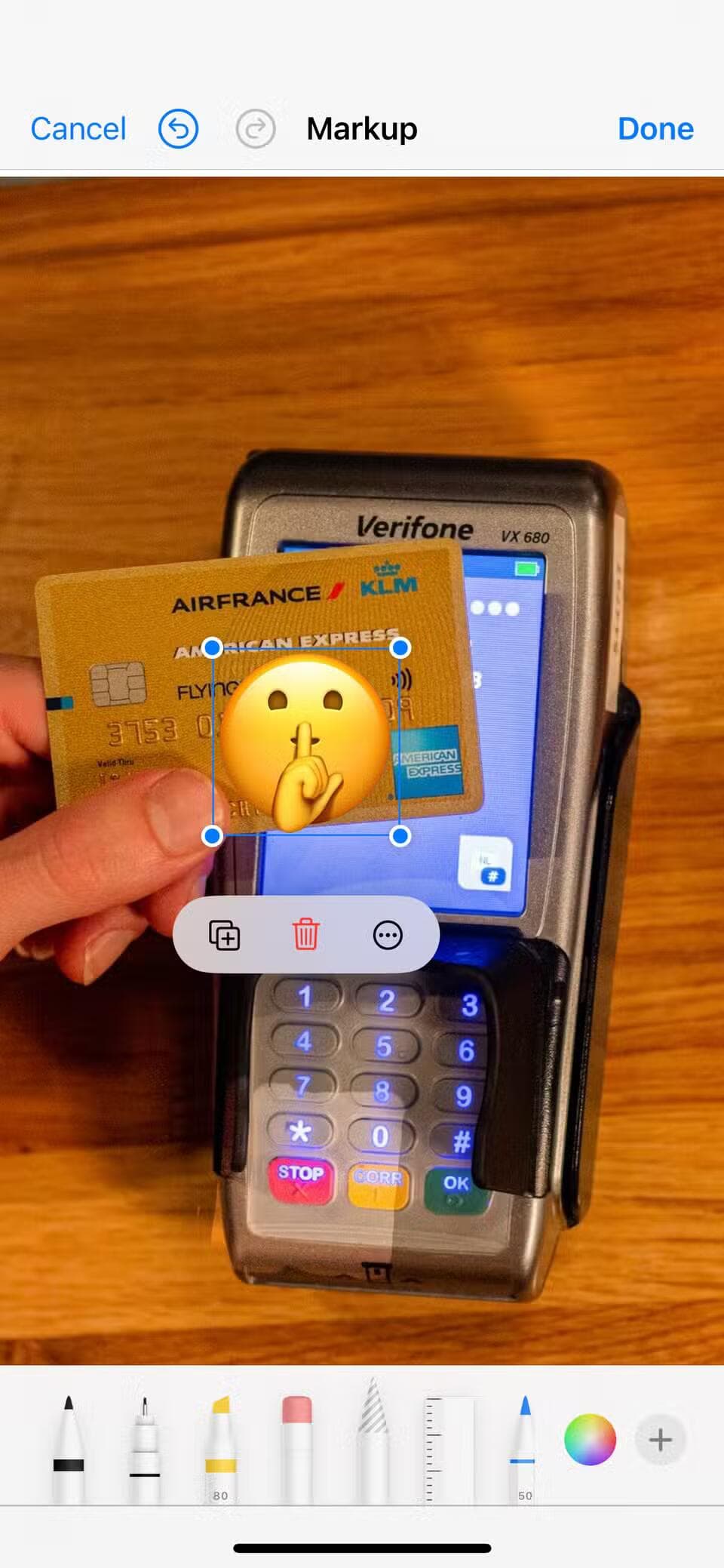 ویرایشگر عکس داخلی آیفون دارای ابزار تار کردن نیست. با این حال، شما همچنان میتوانید بخشهای حساس عکس را با استفاده از ابزار Markup پنهان کنید. این ابزار به شما امکان میدهد تا قسمتهایی از عکس را با ابزارهای مختلفی مانند قلم، شکل، ایموجی و استیکر بپوشانید. در ادامه نحوه استفاده از آن آمده است: