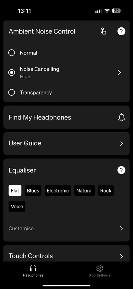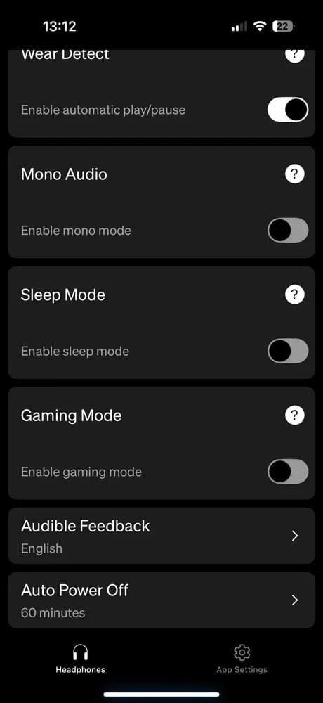 علاوه بر تنظیم سطح حذف نویز و بررسی شارژ، میتوانید تشخیص قرارگیری در گوش را فعال یا غیرفعال کنید (برای توقف خودکار هنگام درآوردن ایرباد)، یا حالتهای مختلف برای خواب یا بازی را تنظیم نمایید. حتی میتوانید زمان خاموش شدن خودکار را تعیین کنید.
