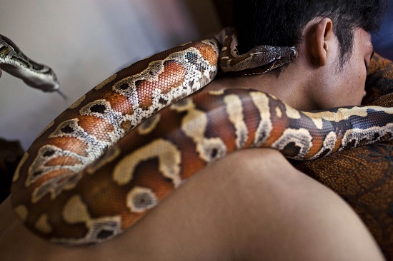 اینجا اندونزی است! فردی که در تصاویر مشاهده میکنید طعمه مار نیست؛ بیمار مار است.