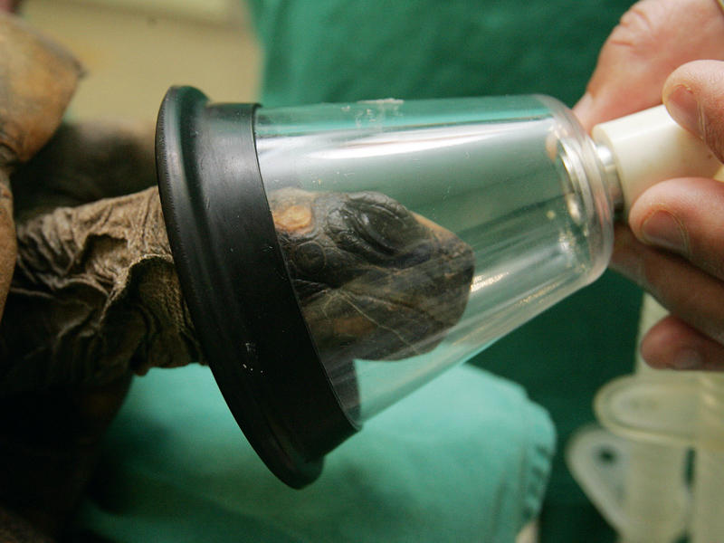 برای نجات این لاکپشت ضروری بود که تخمهایش از طریق عمل سزارین خارج گردد. لذا پزشکان عمل سزارین را برای او انجام دادند.