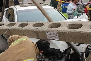 برخورد شدید یک دستگاه خودروی سواری با تیر چراغ برق و شکستگی آن، سقوط تیر را برروی یک دستگاه خودوی پارک شده و مصدومیت راننده را در پی داشت.