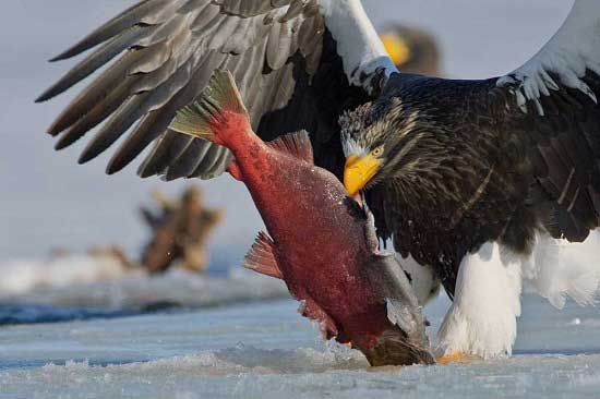 شکار ماهی سالمون در فصل سرما برای حیوانات مناطق سردخیز، منبع غذایی بالایی است. به لطف عکاسی سرجی گرشکو از دریاچه کوریل در روسیه، این تصاویر را با هم ببینیم.