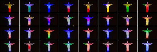 ترکیبی پرچم ۳۲ کشور شرکت کننده در جام جهانی برزیل ۲۰۱۴ بر روی مجسمه مسیح واقع در بالای تپه کورکووادو در ریو دو ژانیرو همزمان با شروع مسابقات.