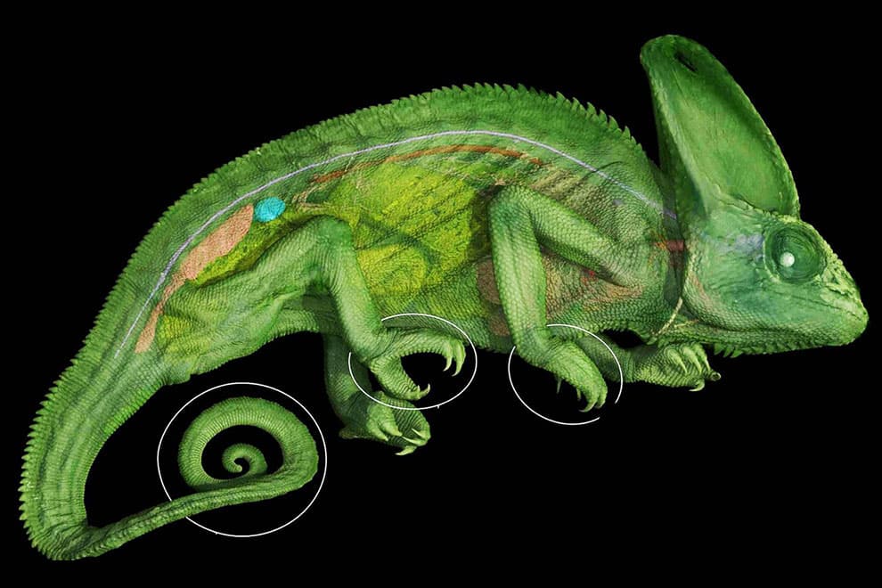 بیش از دو هزار سال است که انسانها با کنجکاوی به چشمان متحرک آفتابپرست نگاه میکنند و نمیدانند این جانور شگفتانگیز چگونه میتواند بدون چرخاندن گردن، چشمهای خود را در جهات مختلف حرکت دهد. اکنون اسکنهای پیشرفته با جزئیات بالا، راز این قابلیت عجیب را آشکار کردهاند: هر چشم با یک عصب بلند و بهشدت مارپیچ به مغز متصل است؛ عصبی که مانند کابل اضافه درون جمجمه پنهان شده است.
