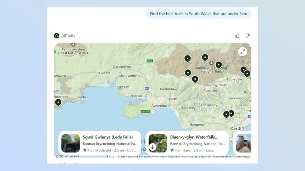 این اپ برای علاقهمندان به طبیعت و پیادهروی بسیار کاربردی است. ChatGPT میتواند با استفاده از AllTrails نقشههایی از مسیرهای پیشنهادی ایجاد کند. مزیت اصلی، گفتوگومحور بودن فرایند جستوجو است؛ میتوانید بهراحتی شرایط را تغییر دهید و مسیرها را دقیقتر فیلتر کنید.