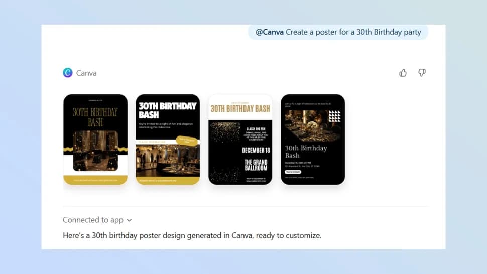 Canva همیشه ابزار محبوبی برای طراحی بوده، اما ادغام آن با ChatGPT کار را سادهتر کرده است. تنها با یک دستور، میتوانید پوستر، پست شبکههای اجتماعی یا قالبهای گرافیکی بسازید. ChatGPT چند نمونه آماده ارائه میدهد که امکان ویرایش مستقیم هم دارند.