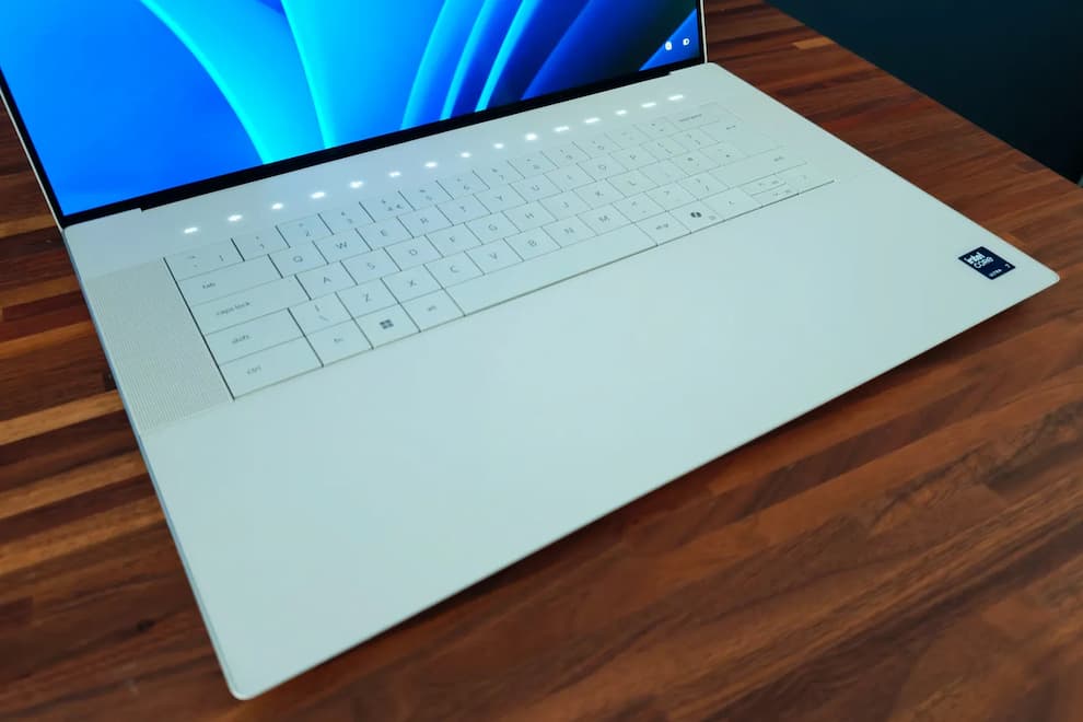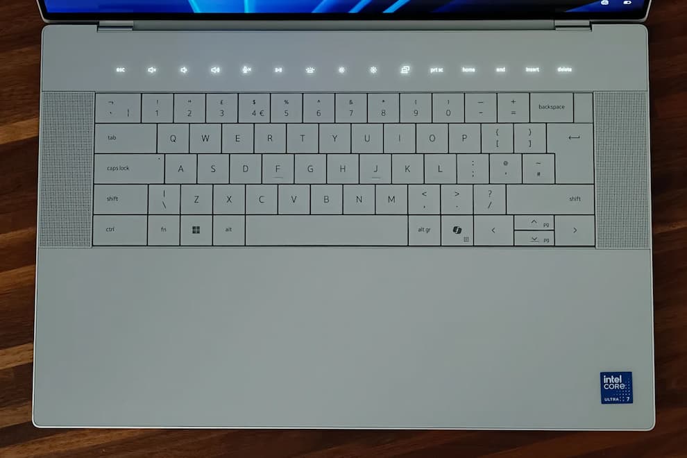 با باز کردن لپتاپ، همان زبان طراحی آشنا از سری XPS را میبینیم: ردیف کلیدهای لمسی نورانی، تاچپد مخفی زیر استراحتگاه دست، و دو grille بزرگ اسپیکر که نشان میدهد دل روی بخش صدا حساب ویژهای باز کرده است.