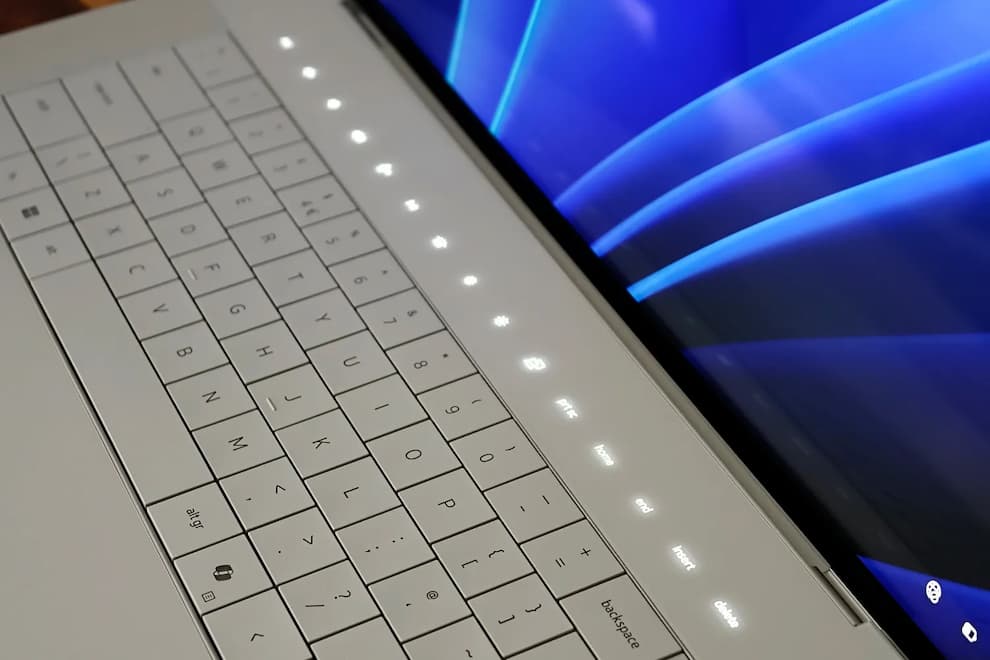 بخش بحثبرانگیز این لپتاپ، ردیف کلیدهای لمسی بالای کیبورد است؛ ردیفی که جایگزین کلیدهای فیزیکی Function شده است. برای تغییر عملکرد بین کلیدهای عملکردی و میانبرهای چندرسانهای، باید کلید Fn را نگه دارید، که در حین کار ممکن است سرعت شما را کاهش دهد.