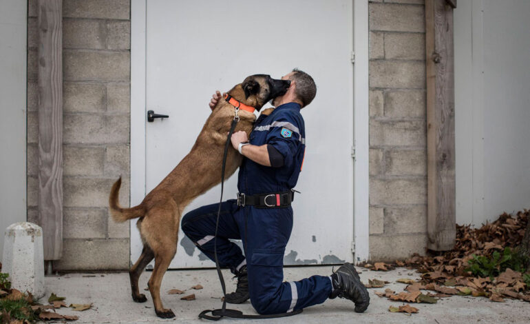 یکی از اعضای واحد تکنیک آتش نشانی با سگی که در حال آموزش استشمام COVID-19 در مدرسه دامپزشکی ملی آلفورت در 15 اکتبر 2020 در پاریس، فرانسه است، کار میکند.