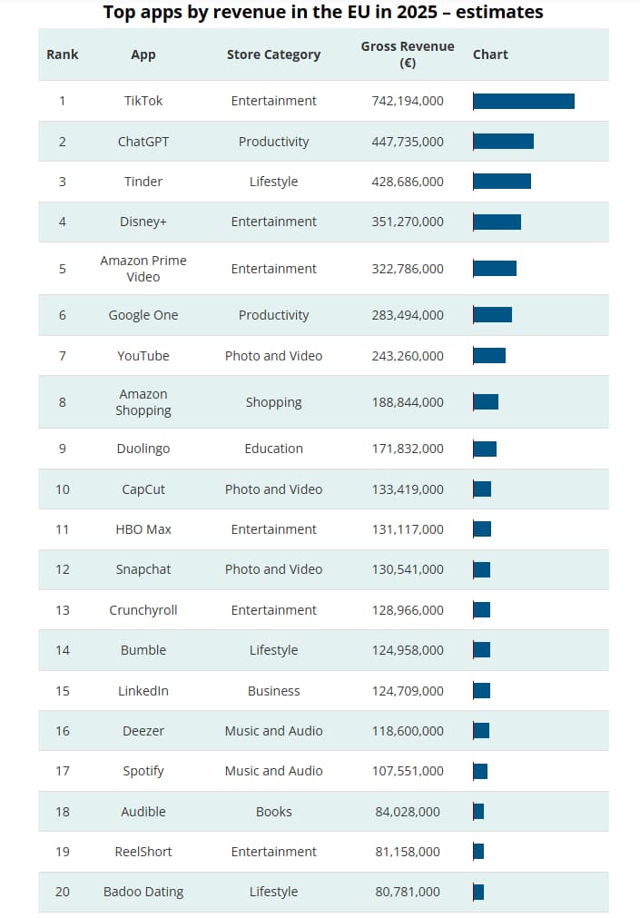 رتبهبندی درآمد تفاوت چشمگیری با رتبهبندی دانلود دارد. TikTok با بیش از ۷۴۰ میلیون یورو درآمد پردرآمدترین اپلیکیشن اتحادیه اروپا است، در حالی که تنها در رتبه چهارم دانلود قرار دارد.