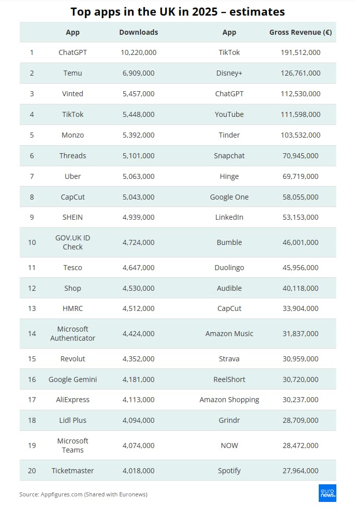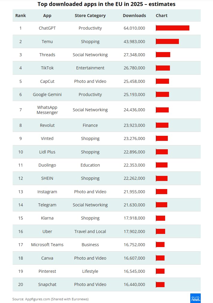 بر اساس برآوردهای AppFigures که با Euronews Next به اشتراک گذاشته شده، رتبهبندی اپلیکیشنهای پردانلود اتحادیه اروپا در سال ۲۰۲۵ نشان میدهد کاربران بیشترین علاقه را به پلتفرمهای بهرهوری، خرید و شبکههای اجتماعی دارند.