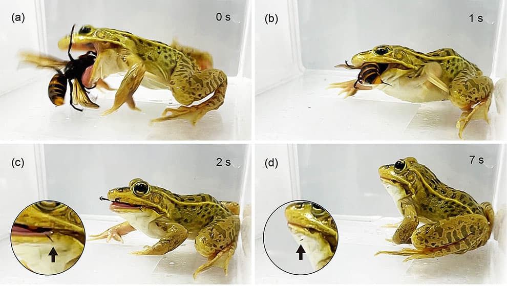 گزارش تصویری این پژوهش نشان داد که حتی زمانی که نیش زنبور در دهان قورباغه فرو میرود، حیوان همچنان به بلعیدن ادامه میدهد.