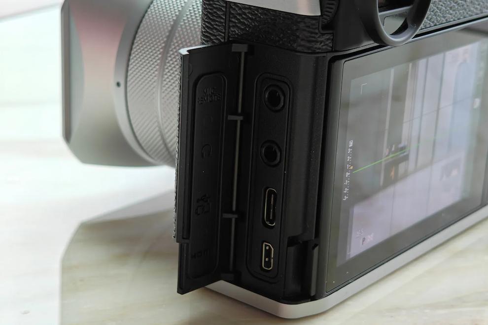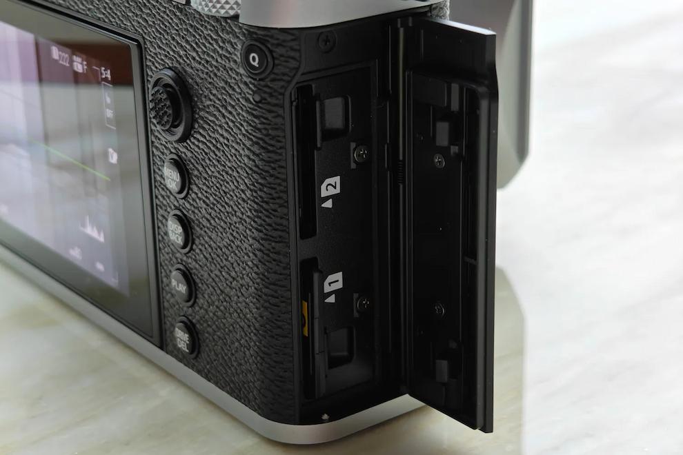 در سمت راست بدنه، دریچهای باز میشود که دو اسلات کارت حافظه SD UHS II را آشکار میکند. پیشنهاد من این است که هر دو اسلات را پر کنید، چون فایلهایی که این دوربین تولید میکند واقعاً حجیم هستند. عکسهای RAW بهطور متوسط بالای ۱۰۰ مگابایت حجم دارند و JPEGها هم فاصله چندانی ندارند. سرعت نوشتن کارتها برای عملکرد عکاسی پیدرپی با سرعت ۶ فریم بر ثانیه کاملاً کافی است؛ چیزی که برای عکاسی خیابانی یا منظره که فوجی برای آن طراحی شده، کاملاً مناسب به نظر میرسد.
