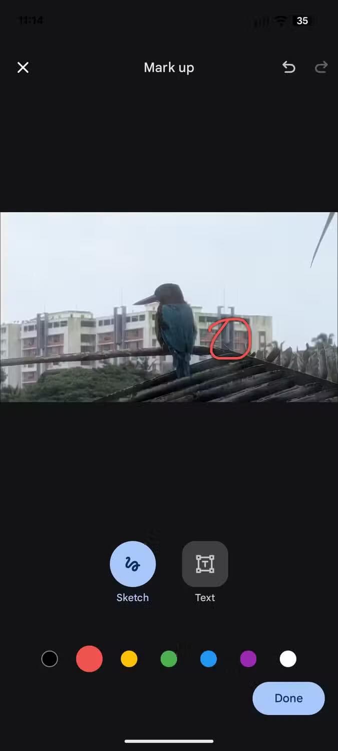 با لمس تصویری که به گفتگو اضافه کردهاید، ردیفی از رنگها نمایش داده میشود که به شما امکان میدهد روی بخش موردنظر خط بکشید یا آن را دایره کنید تا مشخص شود چه تغییری مدنظر دارید. بهصورت پیشفرض، ابزار Sketch فعال است و در کنار آن گزینه Text هم وجود دارد که میتوانید توضیح تغییرات دلخواه را مستقیماً روی تصویر بنویسید. گوگل همین ابزار نشانهگذاری را به نسخه دسکتاپ و وب Gemini نیز اضافه کرده و در آنجا هم همین دو گزینه در دسترس هستند.