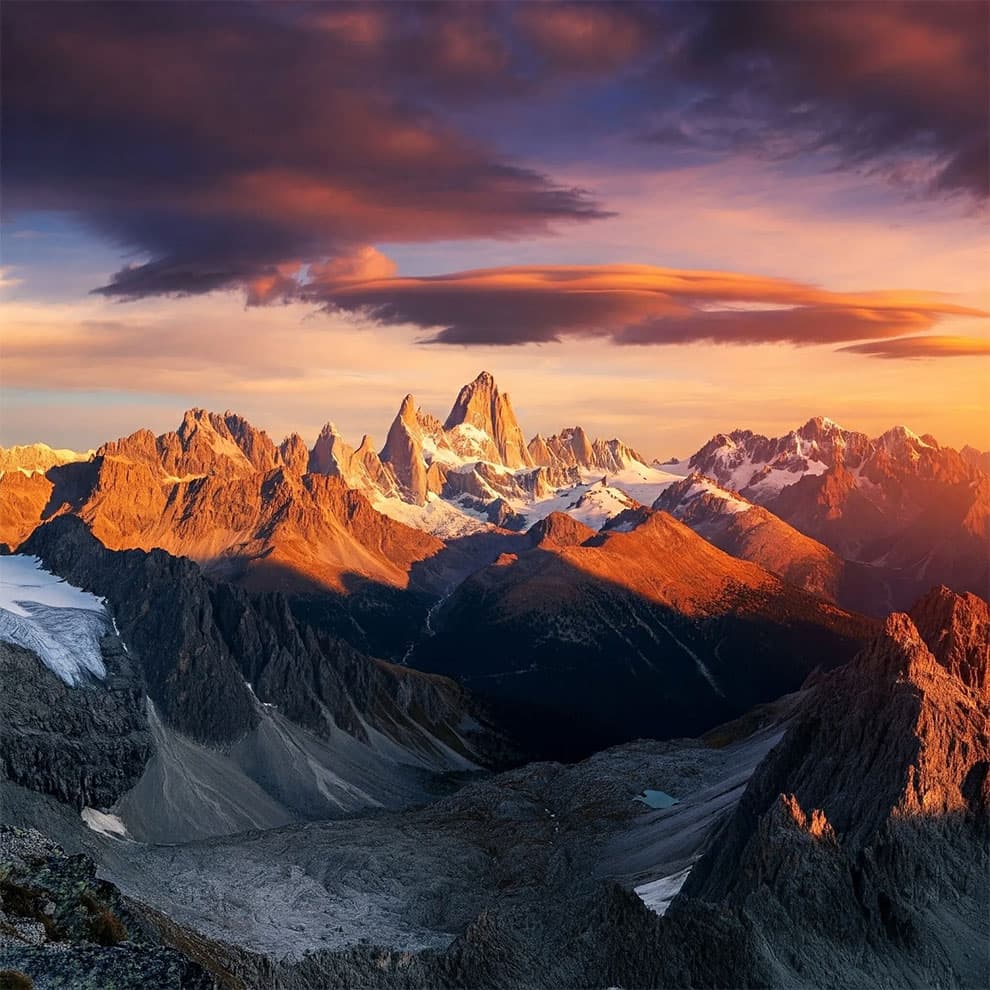 - یک تصویر واقعگرایانه از یک چشمانداز کوهستانی نفسگیر با قلههای دندانهدار و قلههای پوشیده از برف، غرق در نور گرم غروب آفتاب. ابرها چشمگیر، با رنگهای روشن نارنجی، صورتی و بنفش رنگآمیزی شدهاند، در سراسر آسمان خط میکشند و سایههای طولانی بر روی چشمانداز ناهموار میاندازند.