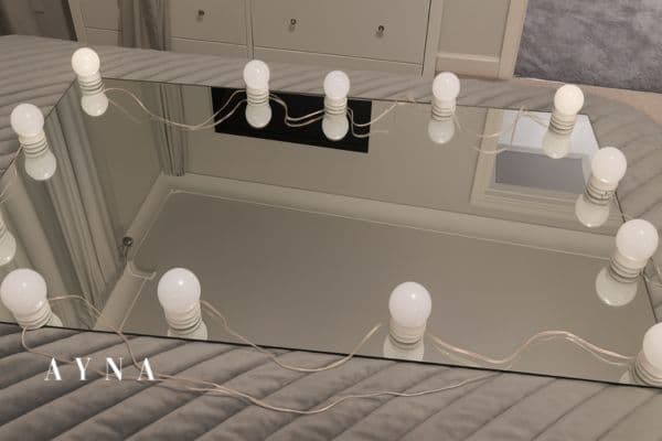 - آینه چراغدار گرد برای میز آرایش: مناسب اتاق خواب یا میز آرایش؛ نور حلقوی یکنواخت و ملایم، ایدهآل برای آرایش و عکاسی چهره. بهتر است از نوار LED با تراکم بالا و کنترل لمسی برای تنظیم دمای رنگ استفاده شود.