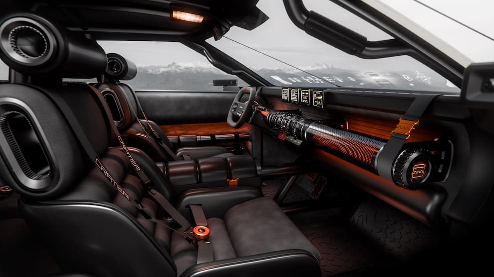 داخل کابین با الهام از نیازهای کاربران ماجراجو و تکنولوژیک شکل گرفته است. اشکال تکنیکال با مواد بادوام و نرم ترکیب شدهاند تا تعادلی بین سختی و صمیمیت ایجاد شود.