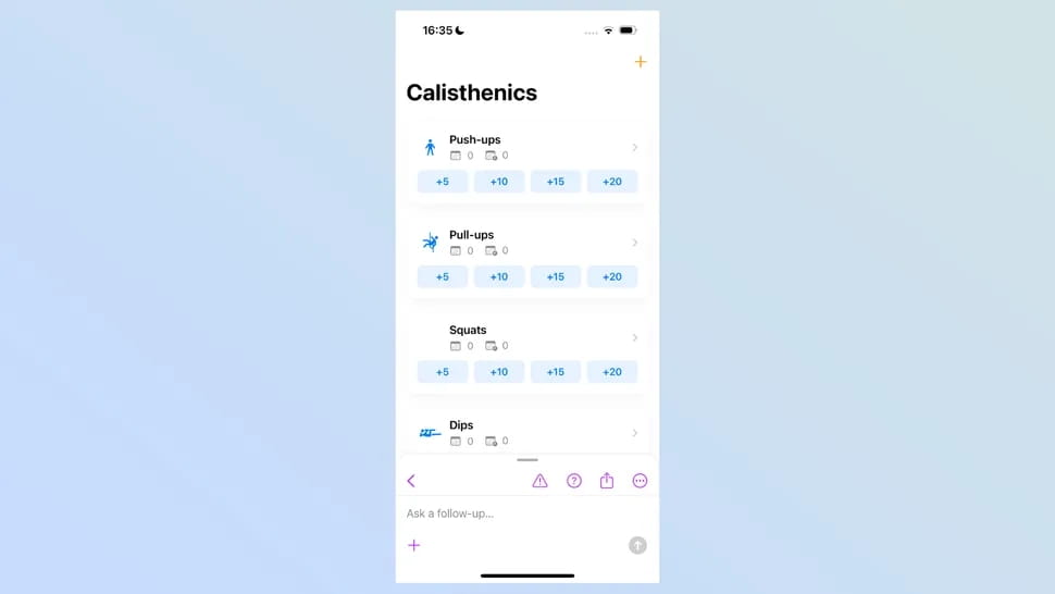 سپس اپ بعدی را امتحان کردم، یک ابزار ثبت تمرینات ورزشی مخصوص کالیستنیکس. هدفم این بود که حرکات روزانه را ثبت کنم. نتیجه از نظر طراحی کاملاً مطابق خواستهام بود، با بخشهایی برای حرکات مختلف و شمارنده برای هرکدام، اما مشکل تکراری باز هم وجود داشت: دکمهها هیچ عملکردی نداشتند. اپ زیبا بود، اما عملاً قابل استفاده نبود.