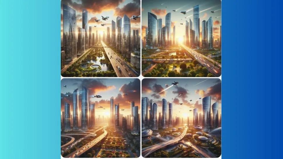 «یک تصویر فوتو رئالیستی از خط افق شهری آیندهنگر در غروب، با ساختمانهای شیشهای و خودروهای پرنده بر فراز شهر، در سبک سینمایی و زاویهی دید باز ایجاد کن.»