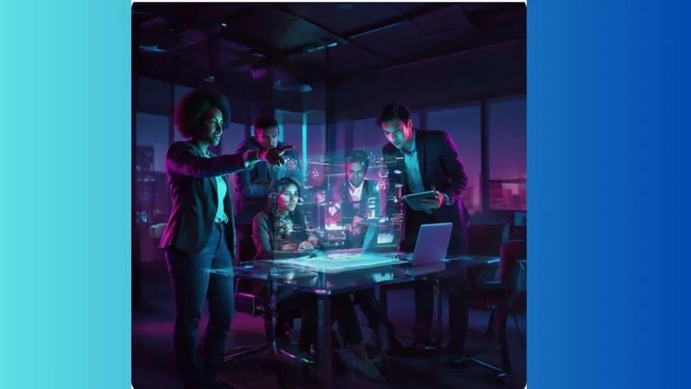 «تصویری با کنتراست بالا برای کمپین تبلیغاتی یک استارتاپ فناوری بساز: چهار نفر از تیم متنوع در حال طوفان فکری دور یک نمایشگر هولوگرافیک با نورپردازی نئون.»