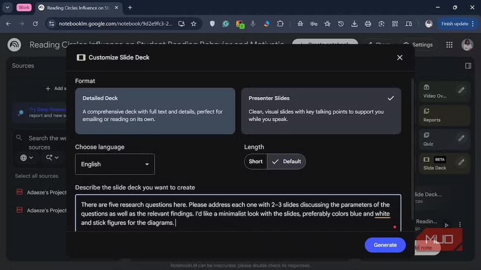 اگر حوصله شخصیسازی ندارید، میتوانید مستقیماً روی Slide Deck کلیک کنید تا NotebookLM با تنظیمات پیشفرض، همه چیز را انجام دهد. در هر دو حالت، چند دقیقه بعد اسلایدها و دیاگرامها آماده هستند.