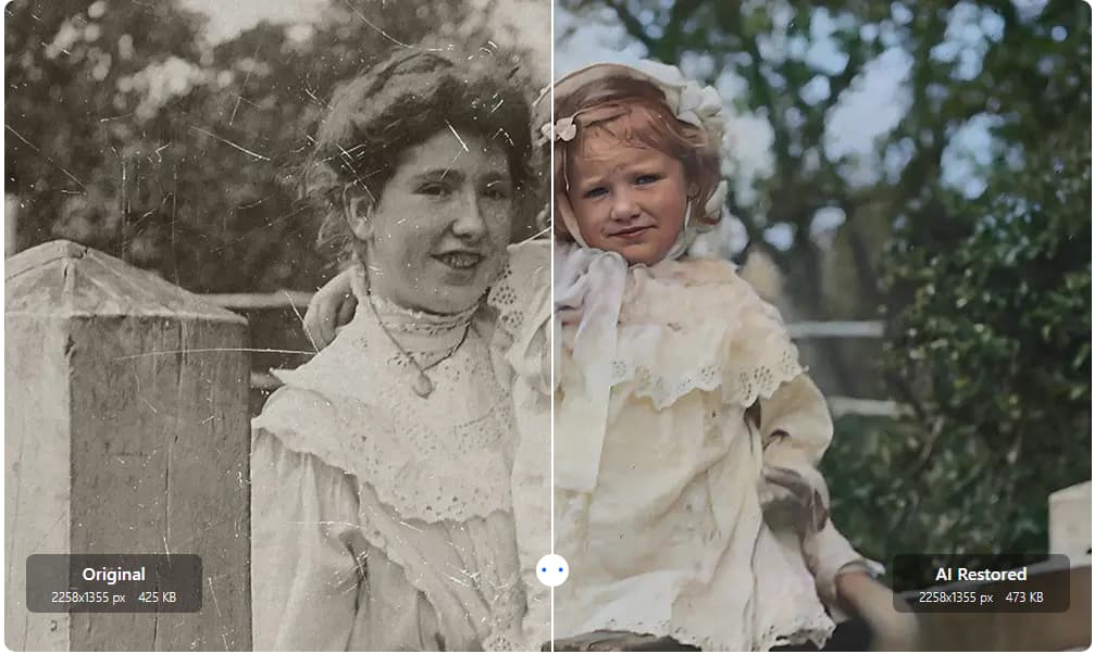 • ترمیم خط و خش و لکه‌ها: هوش مصنوعی به طور خودکار آسیب‌های سطحی تصویر را شناسایی کرده و آنها را حذف می‌کند.