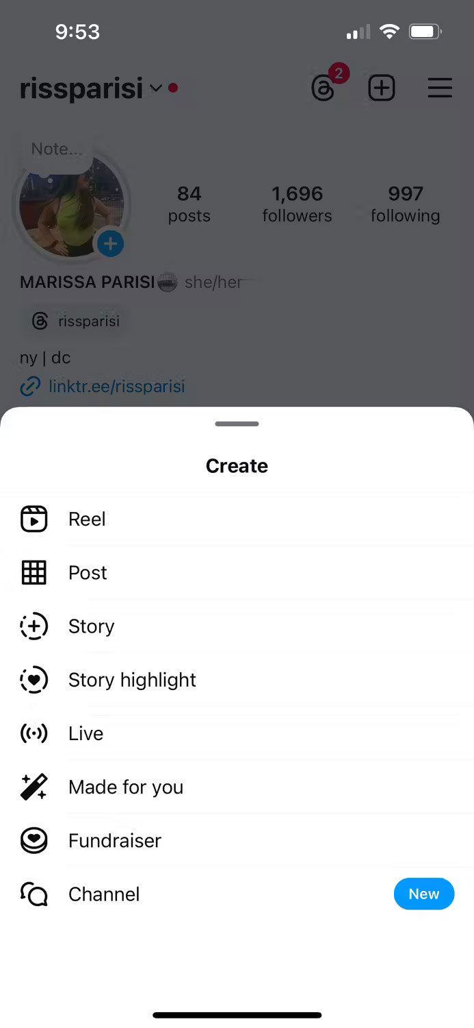 ۱. در اپلیکیشن اینستاگرام، روی علامت مثبت در پایین صفحه بزنید یا اینکه از گوشه سمت راست بالای پروفایل خود آن را انتخاب کنید. از منوی ایجاد شده نیز گزینه Post را انتخاب کنید.