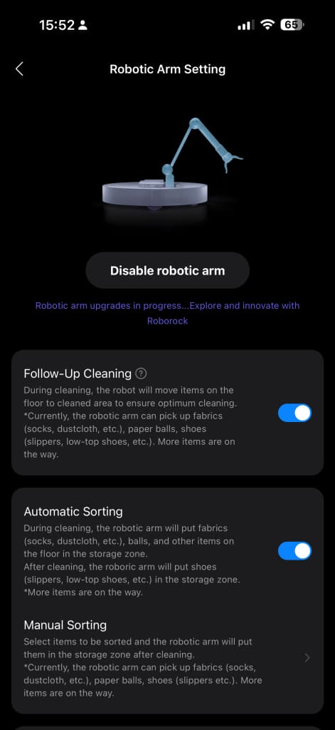 بازوی مکانیکی میتواند اشیای سبک (تا ۳۰۰ گرم) مانند جوراب و دمپایی را بلند کرده و به مکان خاصی منتقل کند، یا آنها را بردارد، زیرشان را تمیز کند و دوباره در جای خود بگذارد. این قابلیتها از طریق اپلیکیشن Roborock قابل تنظیم هستند.
