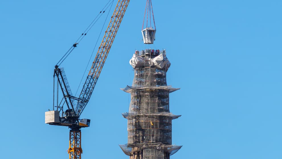 آخرین قطعه صلیب با کمک جرثقیل در بالاترین نقطه برج عیسی مسیح نصب شد. صدها گردشگر در اطراف کلیسا جمع شدند تا این لحظه تاریخی را تماشا کنند.