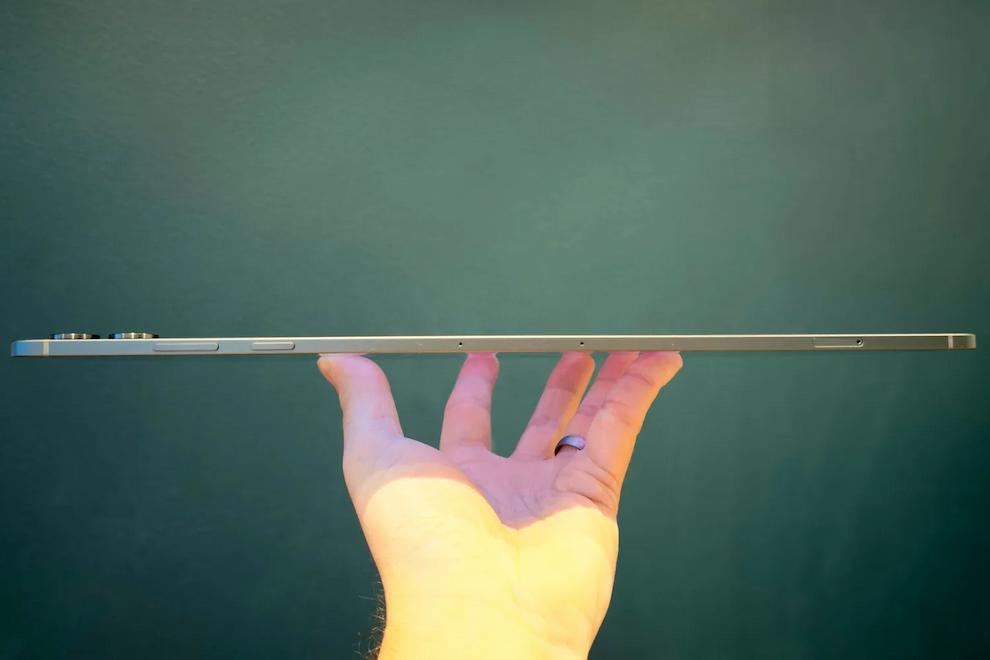 در نهایت، با وجود این تغییرات، تبلت همچنان بدنهای بزرگ از شیشه و فلز دارد که با آلومینیوم مقاوم Enhanced Armor ساخته شده است. رنگهای خاکستری و نقرهای همچنان پابرجا هستند، اما ضخامت دستگاه به تنها ۵.۱ میلیمتر رسیده و وزن آن نیز ۶۹۲ گرم است؛ عددی که باعث میشود بتوان آن را با یک دست نگه داشت، هرچند برای کار طولانی دو دست لازم است.