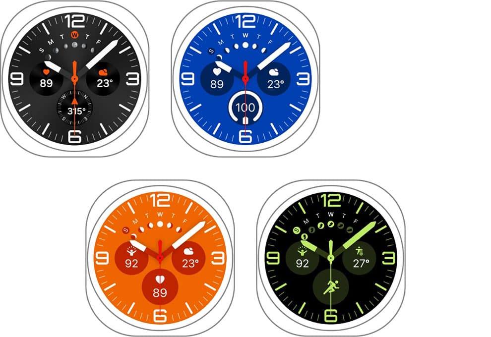 خلاقیتهای طراحی Galaxy Watch Ultra، با وجود صفحه ساعت (Watch Face) اختصاصی که هماهنگی کاملی با طراحی هندسی فرم ساعت ارائه میدهند، تکمیل میشود. این پسزمینههای متنوع، به شما اجازه میدهند ظاهر ساعت را به خوبی با استایل و سلیقه شخصی خود هماهنگ کنید. واچ فیسهای Ultra Analog، قابلیتهای با عملکرد بالا را به همراه 9 امکان از جمله: ضربان قلب و قدمشمار نشان میدهد که این گزینهها میتوانند با الگوهای تمرین شما بهینه شوند تا به طور موثرتری به اهداف تناسب اندام خود دست پیدا کنید. واچ فیسهای Simple Ultra نیز علاوه بر اینکه ظاهر کلاسیک ساعت را حفظ میکند، بر ماهیت ساعتهای لوکس تمرکز دارد تا مطابق با سبکها و سلیقههای مدرن باشد. بنابراین با انتخاب واچ فیس مناسب برای هر موقعیتی، میتوانید به خوبی سبک شخصی خود را به نمایش بگذارید.