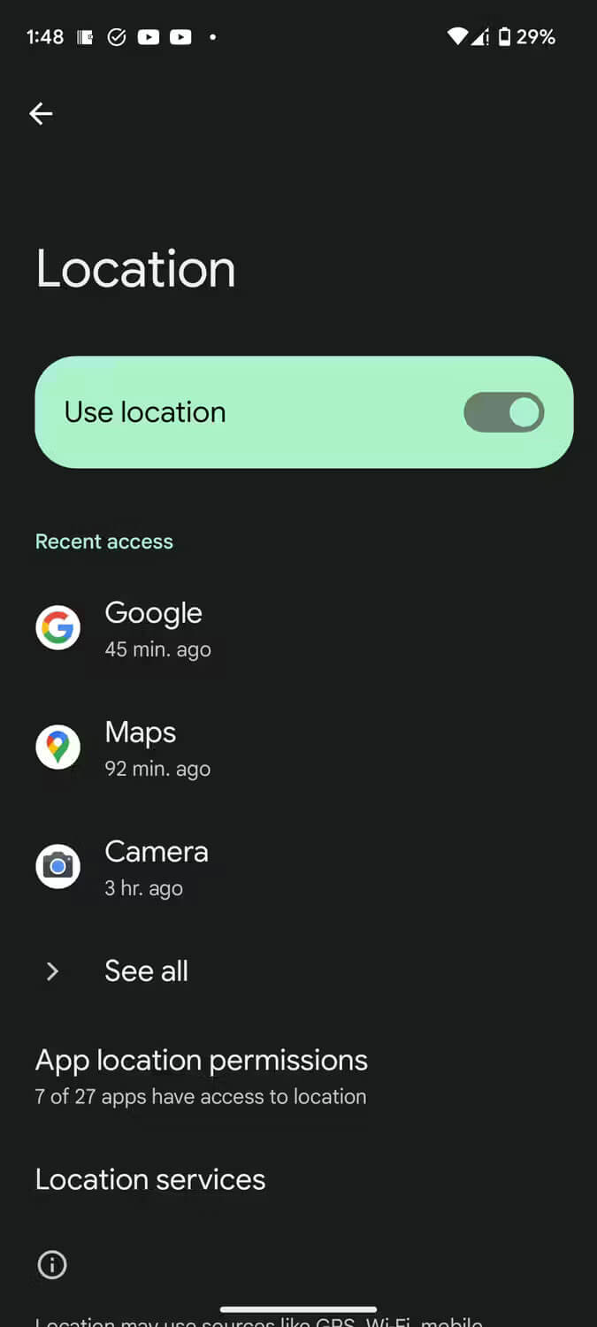 اعطای مجوز به برنامههای اندرویدی ساده است و ممکن است گاهی اوقات هنگام استفاده از برنامه برای اولین بار این کار را انجام بدهید. خوشبختانه، اندروید به شما نشان میدهد که کدام برنامهها به دادههای موقعیت مکانی شما دسترسی دارند و این مسئله در بخشی از برنامه تنظیمات قابل دیدن است. نحوه دسترسی آن نیز به صورت زیر است: