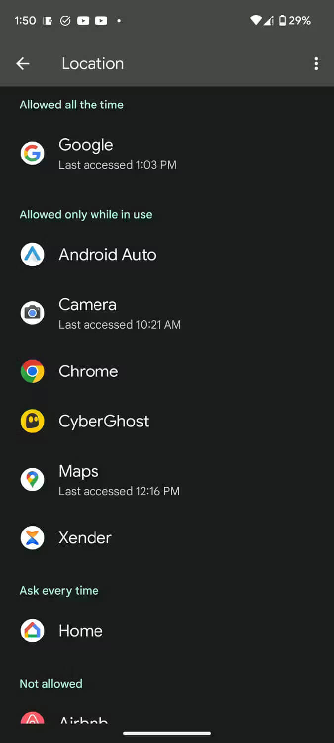 ۳. گزینه App location permissions را انتخاب کنید تا لیست اپلیکیشنهایی که به لوکیشن شما دسترسی دارند را مشاهده کنید. در زیر بخش Not allowed نیز شما میتوانید لیست اپلیکیشنهایی را ببینید که به موقعیت مکانی شما دسترسی ندارند.