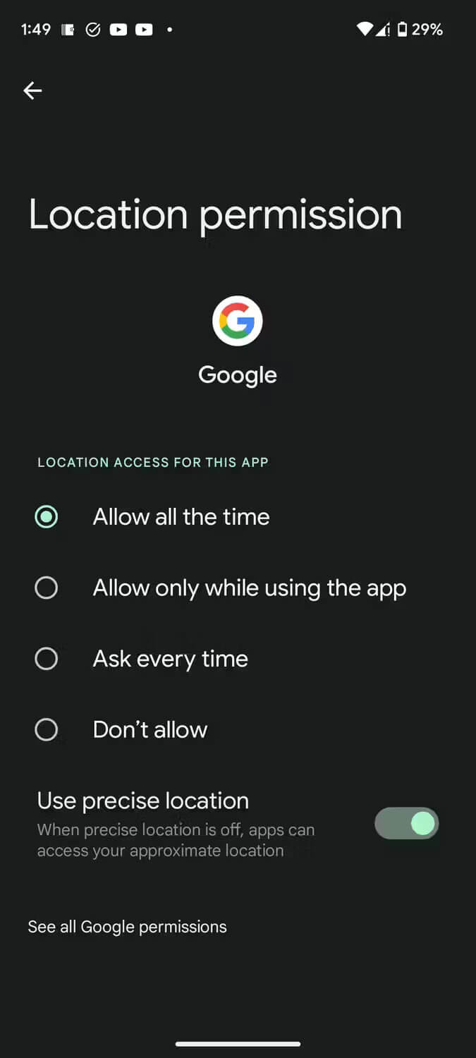 توجه داشته باشید که گزینههای ذکر شده در بالا و در منوی مجوز موقعیت مکانی ممکن است برای هر برنامهای متفاوت باشند. وقتی که مجوز موقعیت مکانی را به یک برنامه میدهید، میتوانید در صورت لزوم نیز گزینه استفاده از مکان دقیق را نیز فعال کنید. این ویژگی به برنامههایی مانند اوبر و گوگل مپ کمک میکند تا مکان شما را تا حد امکان دقیق تشخیص بدهد.