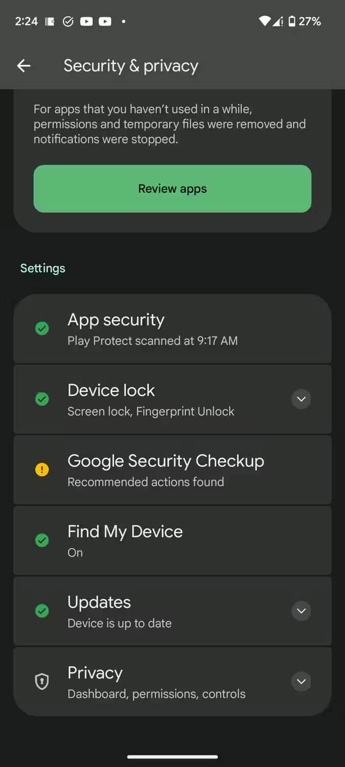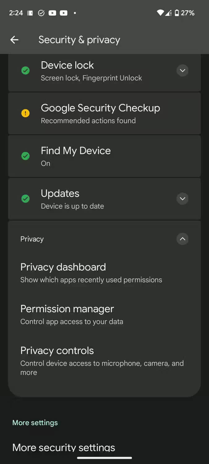 ۱. برنامه Settings را باز کرده و سپس به بخش Security & privacy بروید.