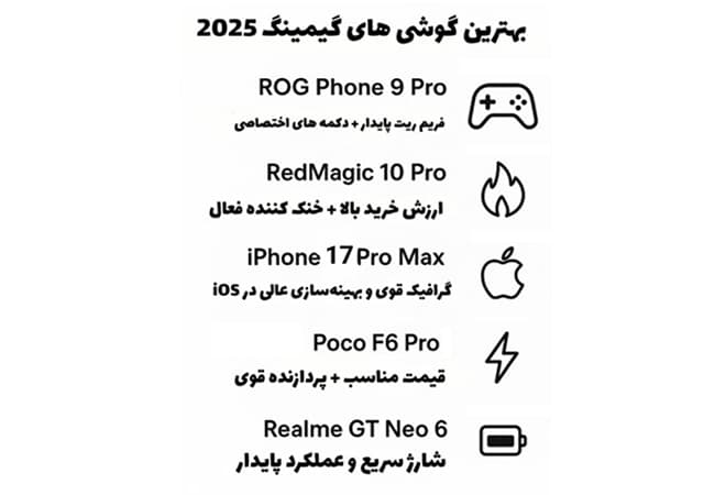 ممکن است این سوال برایتان پیش آید که کدام گوشی برای بازی مناسب است؟ در ادامه به مقایسه و بررسی بهترین گوشی مناسب بازی در سال ۲۰۲۵ میپردازیم که شامل گوشی اقتصادی برای بازی تا گوشیهای پرچمدار میشوند: