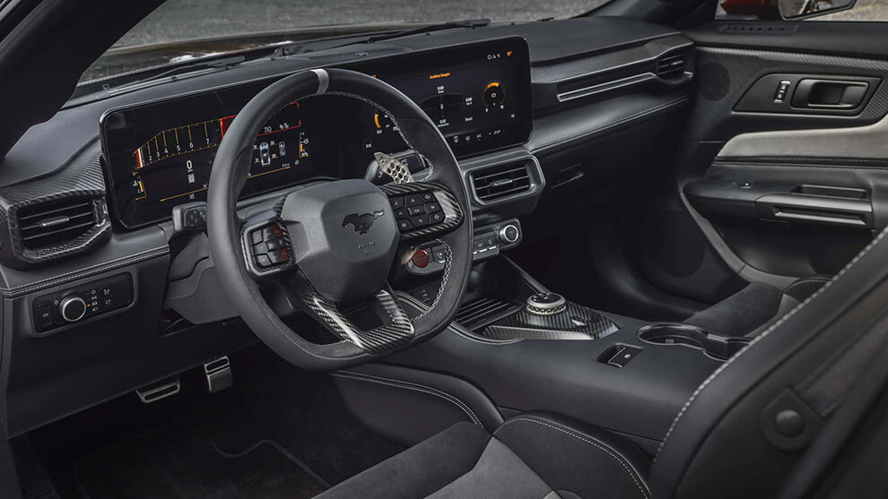 همچنین برای اولین بار نگاهی به داخل GTD داریم. بخشهای داخلی بسیار شبیه به موستانگ هستند با صفحهنمایشهای ۱۳.۲ اینچی و ۱۲.۴ اینچی که در تریمهای پریمیوم یافت میشوند. GTD صندلیهای استاندارد رکارو، گرافیکهای ویژه برای صفحهنمایشها، پدالهای شیفتر تیتانیومی و دو دکمه جدید در کنسول مرکزی دارد. یکی از این دکمهها برنامههای مختلف پیست GTD را باز میکند و دیگری ویژگی بالابری محور جلو را فعال میکند. فرمان خاص GTD نصب شده و ما قبلاً پنجره شفافی را که برای مشاهده تعلیق پوشراد در عمل تعبیه شده بود، بررسی کردهایم.