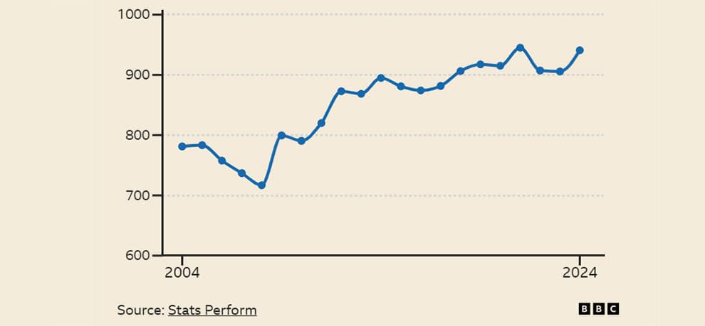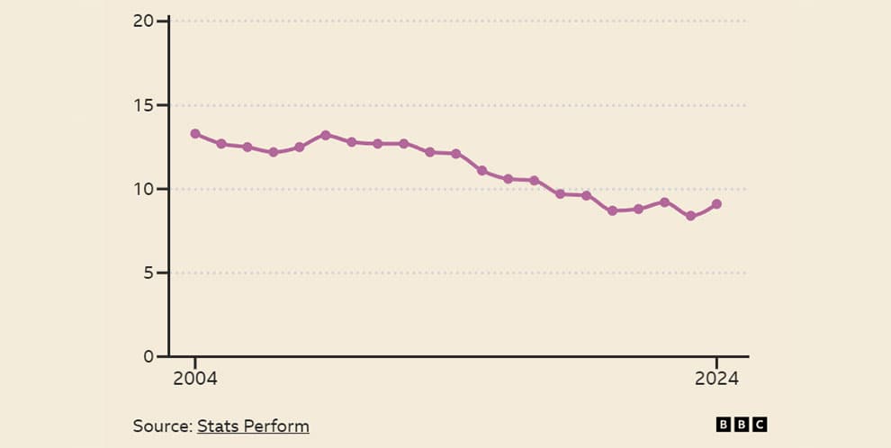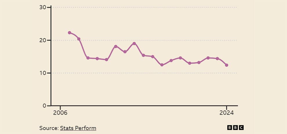 از زمانی که StatsPerform از سال 2003-04 شروع به جمعآوری دادهها کرده است، میانگین تعداد شوتها از خارج از محوطه جریمه در هر بازی لیگ برتر به طور پیوسته و قابل توجهی از 13.3 به 9.1 در فصل گذشته کاهش یافته است، که کاهش 32% را نشان میدهد.