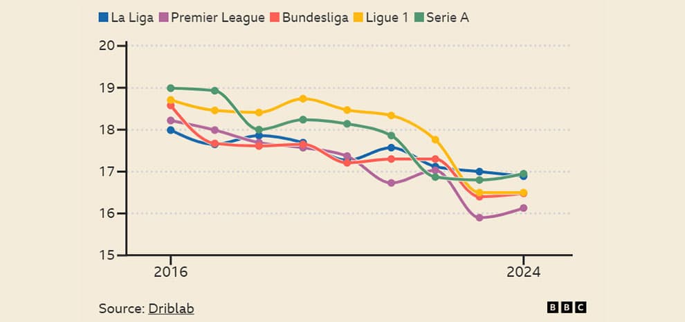 میانگین فاصله شوتها در طی نه فصل گذشته در همه پنج لیگ، به جز لالیگا که کاهش آن 1.2 یارد متوسطتر است، حدود 2.5 یارد کاهش یافته است.