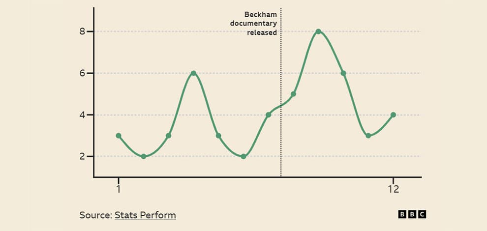 انتشار سریال مستند نتفلیکس که زندگی حرفهای دیوید بکهام را دنبال میکرد – اولین قسمت آن روی گل معروف دوربرد او مقابل ویمبلدون در سال 1996 تمرکز داشت – با چهار برابر شدن شوتها از 30 یارد و بالاتر در لیگ برتر همراه بود.