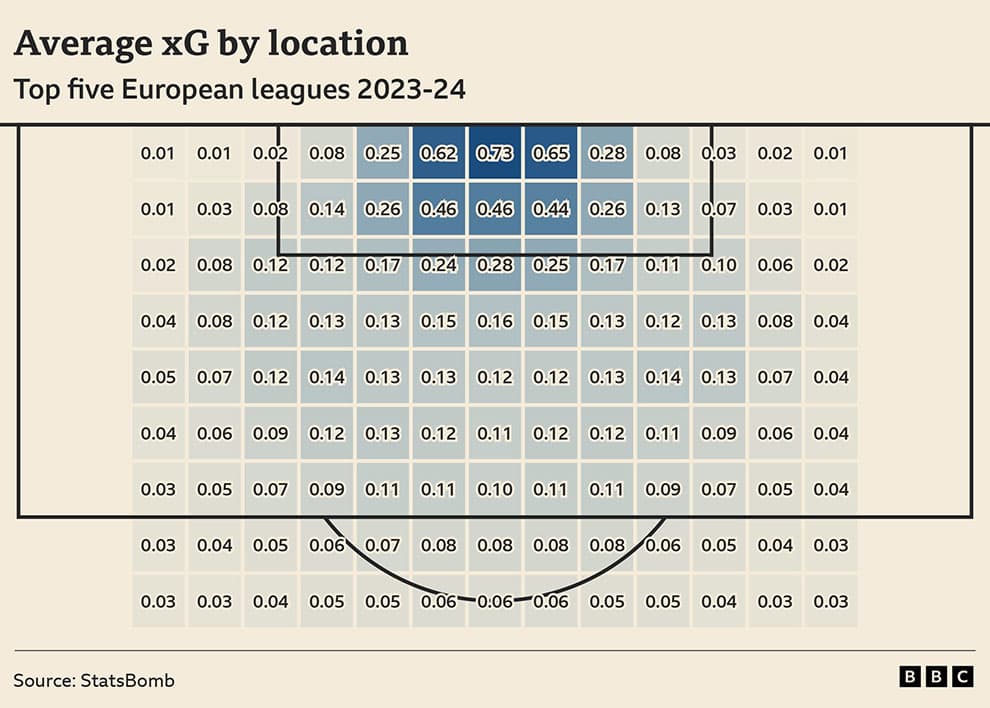“جیمز یورک”، مدیر فوتبال در “StatsBomb”، یکی از شرکتهای پیشرو در زمینه تحلیل و تأمین دادههای ورزشی، میگوید: “من یک محاسبه سریع انجام دادم. پس از حدود ۲۵ یارد، ارزش گل مورد انتظار یک شوت تقریباً 0.03 است، بنابراین تقریباً یک در ۳۳ گل میشود. از ۲۰ یارد، این دو برابر میشود، اما همچنان فقط 0.06 است.